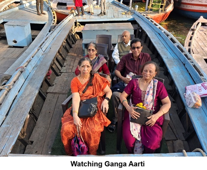 The Aarti begins about 15 minutes after sunset (which was around 6 PM on that day). The evening Ganga Aarti at Dashashwamedh Ghat is the grandest, with multiple priests performing synchronized rituals. I understand that Rajendra Prasad Ghat, located next to Dashashwamedh, also hosts a significant aarti. Watching the aarti from a boat provides a unique perspective, as boats line up along the ghats to offer unobstructed views. Pankaj Pande had arranged ringside seats for us in a boat in the front row almost opposite the Aarthi site. It was worth the Rs. 3000/- that we spent.