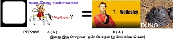 Pictorial Puzzle குறிப்பு - 2095 D - இதை Solve செய்ய ஒத்த ஒலியமைப்பு அல்லது ஒலியமைப்பில் மாற்றம் இருந்தாலும் அதே எழுத்துக்கள் கொணட சொற்கள், பேச்சுவழக்குச் சொல்லாகவும் இருக்கலாம். ஆங்கிலம், தமிழ் சில சமயம் இந்தியிலும் யோசிக்க வேண்டும்.