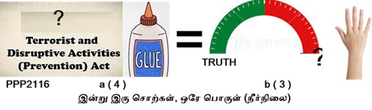 Pictorial Puzzle குறிப்பு - 2116 D - இதை Solve செய்ய ஒத்த ஒலியமைப்பு அல்லது ஒலியமைப்பில் மாற்றம் இருந்தாலும் அதே எழுத்துக்கள் கொணட சொற்கள், பேச்சுவழக்குச் சொல்லாகவும் இருக்கலாம். ஆங்கிலம், தமிழ் சில சமயம் இந்தியிலும் யோசிக்க வேண்டும்.