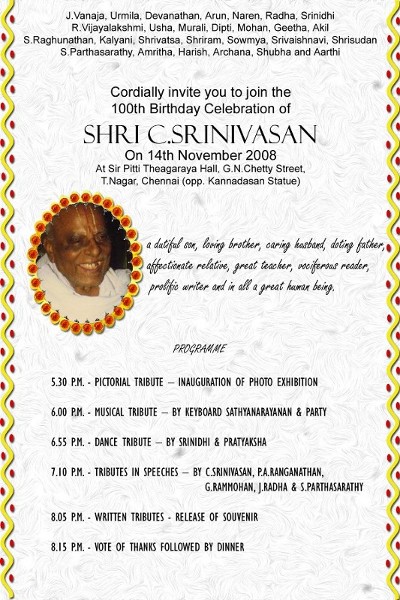 After a lot of discussions, we decided that we would celebrate the occasion in an auditorium that can accommodate 200 persons and that we would have -- Pictorial Tribute (with 100 photos), -- Musical Tribute by child prodigy Keyboard Sathyanarayanan, -- Dance Tribute by Srinidhi and Pratyaksha (my father's great graddaughters), -- Oral Tributes by five speakers who would be chosen from children, grandchildren, relatives, students and colony residents, -- Written Tribute in the form of a Souvenir containing articles by as many as possible and finally -- serve to all guests items of food liked by my father.