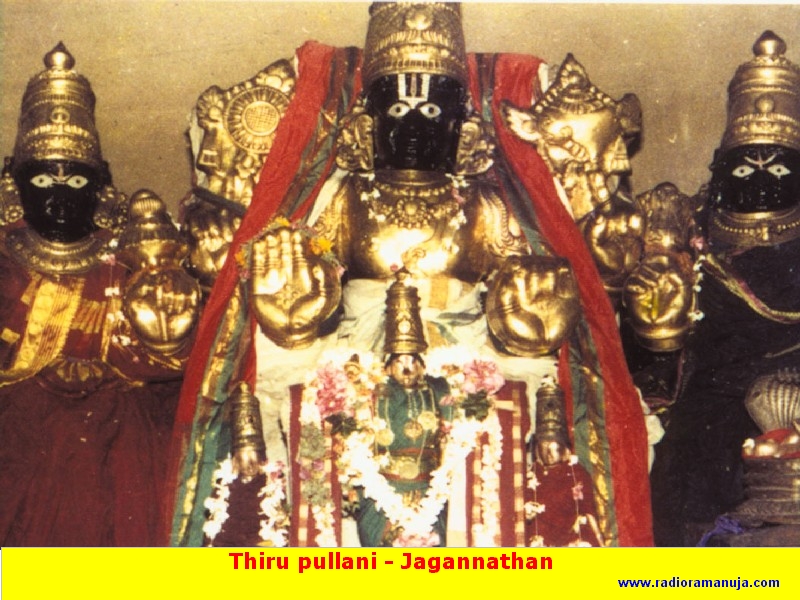 Srirama, lying on Dharba(Dry twigs) requested for Samudrarjan to make way for the construction of bridge to retrieve Sita from Lanka - hence people worship him here as Dharbasayana Rama. In this temple Lakshmana is serving(doing kainkarya). Rama can be seen as Aadisesha and in Pattabhisheka Sannidhi He is in the traditional form. The Lord presented Himself under the Ashwwattha tree to pullva Maharishi here, pleased with his Ashtakshara Japa and hence this place is called Pullaranya. Sethusnan is considered to be very auspicious. Rameshwaram is nearby and Danushkoti, washed away in cyclone and floods, was near this place.