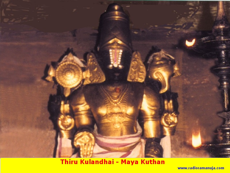 This is one among the Azhwar Nava Tirupathi. As per the stahala purana, Kamalavathi daughter of Vedasaran, Meditated on the Lord intending to marry only Him. Pleased with her efforts, The Lord embraced her and then married her. Hence this place is also Balika vanam. The Lord slayed the demon Amsarajan in a Mayayuddha at Balikavanam and danced over him and took the name Mayakoothan (Koothu - Folk Dance) at the request of the Devas. Swami Manavala mamunigal has done a mangalasasanam for this Sthalam. This place is also Known as Periyankulam and it is the farthest from Sivaikuntam/ Azhwar Thirunagri (about 11 KMs Northeast from Srivaikuntam).One can also come here from Thirupulingudi .There are no facilities here.