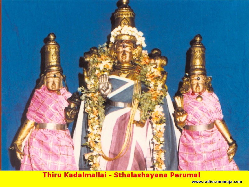 There are Sannidhis for Rama and Andal.The Lord gives darshan in sayana with His right hand in Upadesa Mudra. Pundareega Maharishi is seen standing with folded hands at the Lords feet. As per Sthala purana, Pundareega Maharishi with lotus flowers desirous of worshipping the Ksheerabdi nathan walled westwards and found the sea preventing him. The Maharishi with Bhakti blinding him, started clearing the water with his hands. The Lord came in the guise of a old Brahmin and asked for food. When the Maharishi came with the food, he found the Lord as in Ksheerabdi in sayana form on Adisesha adorned with the flowers brought by him. Hence called Sthalasayana Perumal. Mahabalipuram is very famous for its sculpture. The important among them are Bhagiratha thapas, Panchapandava Mandapa, Govardhan Mandapa, Arjuna Tapas , etc. Boodathazhwar's avathara sthalam.