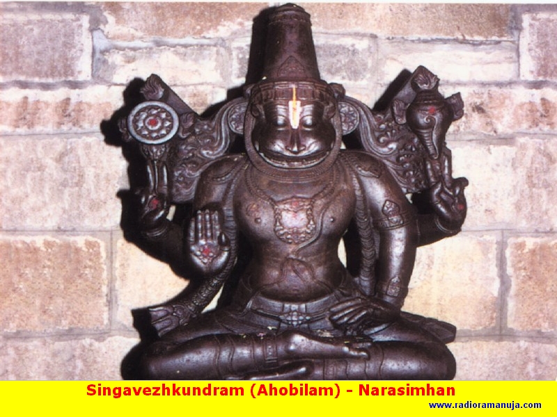 As per Sthalapurana, Garuda performed Tapas to have the Darshan of Nrisimha of Vibhavathara. Granting the boon to Garuda, the Lord settled amidst the hills and dense forests in nine different forms mentioned above. Hence this holy hill is called Garudadri, Garudachalam and Garudasailam. It is also believed that the Lord killed Hiranyakasipu and saved Prahlada at this Kshetra. As Lord settled here forgetting even the Srivakunta, Mahalakshmi took avatar in the Hunter's family and married the Lord and hence called Senjulakshmi (Senju - Hunterfolk). There is temple for Prahladavarda at lower Ahobilam.